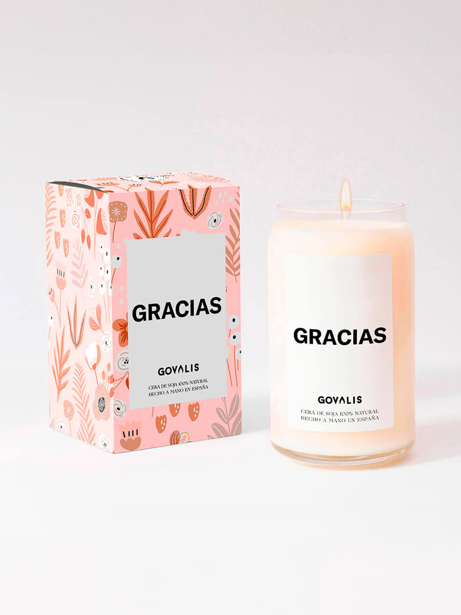 - Notas: La vela aromática de Gracias contiene notas de salida afrutadas de bergamota y cassis. El corazón es dulce con toques florales con jazmín, lirio de los valles, orquídea, rosa, miel y chocolate que lleva a una base con notas amaderadas de vainilla, caramelo, soft chill, tonka, pachulí, sándalo, almizcle y ámbar.